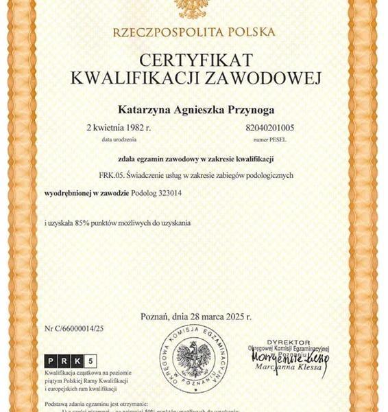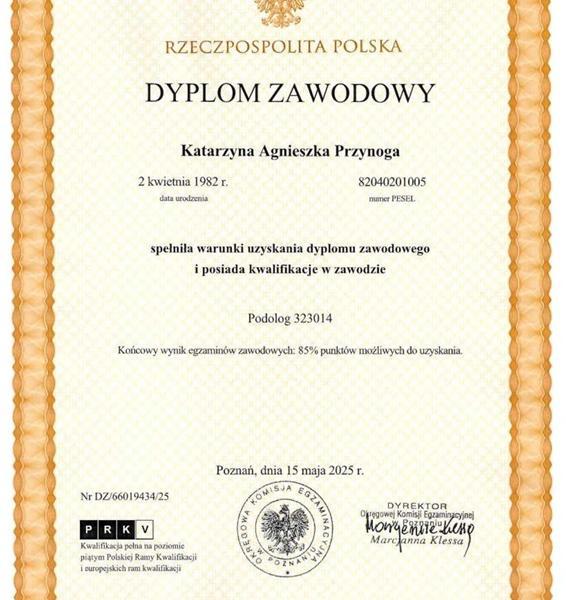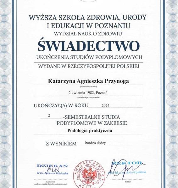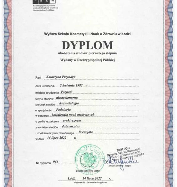 Technikum kosmetyczne ukończyła w 2003r ze spacjalizacją z pedicure medycznego. Tytuł kosmetologa uzyskała w Wyższej Szkole Kosmetyki i Nauk o Zdrowiu w Łodzi ze specjalizacją z podologii. Podologia to jej pasja i nieustannie pogłębia swoją wiedzę w tej dziedzinie . Systematycznie uczestniczy w konferencjach, kongresach i szkoleniach, które pozwalają być na bieżąco z najnowszymi metodami i trendami.